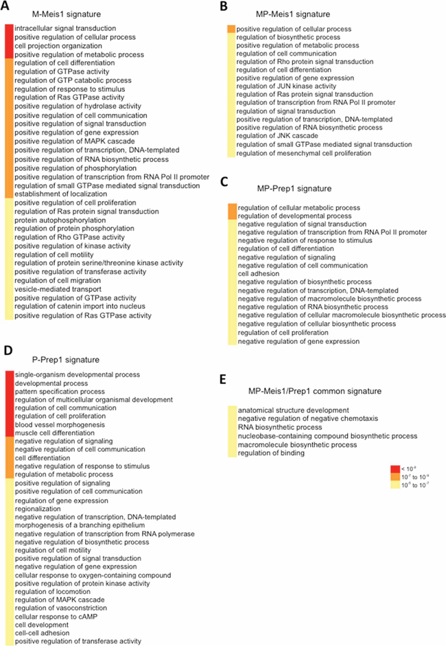 The analysis of Figure 6 shows in most signatures a statistically very significant enrichment of gene categories involved in signal transduction, transcription from PolII promoter, gene expression, cell proliferation, cell communication. Importantly, the comparison of the M-Meis1 (Figure 6A) and the MP-Prep1 (Figure 6C) signature evidentiated the same categories. However, the genes within these categories had opposite function in the two signatures: positive in Meis1 versus negative in Prep1.