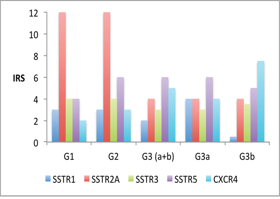 The SSTR subtype and CXCR4 expression of all positively stained specimens is shown for different staining levels in Table 3 (IRS > 2 and < 5 = weak staining; IRS ≥ 5 and ≤ 8 = moderate staining; IRS > 8 = strong staining; Figure 5).