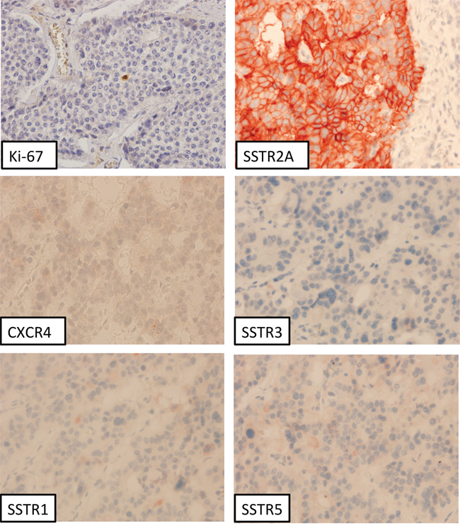 Although some studies have shown that CXCR4 is expressed in G3 NEC as well, comprehensive data are still missing for this tumor type [16, 17]. Thus, the present investigation aimed to determine whether different SSTR (SSTR1, 2A, 3 and 5) and CXCR4 are co-expressed in G1-G3 neuroendocrine tumors and carcinomas by means of immunohistochemistry, using highly specific monoclonal antibodies.