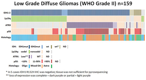 Figure 2: Low grade diffuse gliomas. Data regarding IDH status, 1p19q codeletion, ATRX status, p53 expression, and histological diagnosis are summarized for all patients (n = 159). Each column represents a patient.