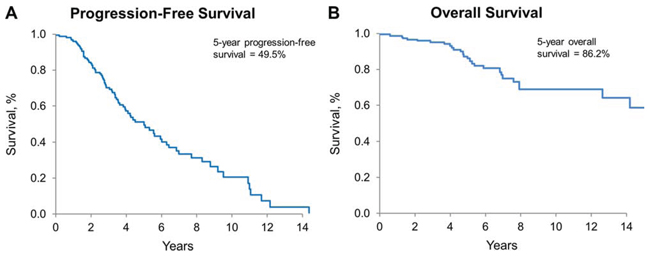 Figure 3: Progression-free and overall survival for all patients. A. PFS for all patients, estimated by Kaplan-Meier method. 5-year PFS: 49.5% (95% CI: 40.6%–60.4%). B. OS for all patients, estimated by Kaplan-Meier method; 5-year OS: 86.2% (95% CI: 79.4%–93.5%)