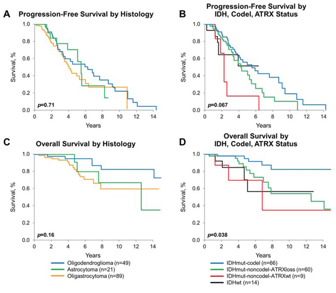Figure 4: Progression-free and overall survival by diagnosis and molecular subgroups. A. PFS by histologic diagnosis, estimated by Kaplan-Meier method, p = 0.71. B. OS by histologic diagnosis, estimated by Kaplan-Meier method, p = 0.16. C. PFS by molecular subgroup [IDHmut-codel (n = 65), IDHmut-noncodel-ATRXloss (n = 59), IDHmut-noncodel-ATRXwt (n = 9), IDHwt (n = 14)], estimated by Kaplan-Meier method, p = 0.067. D. OS by molecular subgroup [IDHmut-codel (n = 66), IDHmut-noncodel-ATRXloss (n = 60), IDHmut-noncodel-ATRXwt (n = 9), IDHwt (n = 14)], estimated by Kaplan-Meier method, p = 0.038. All p-values adjust for age, sex, histomorphologic diagnosis, extent of resection, and treatment.