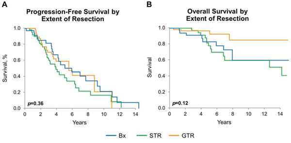 Figure 5: Progression-free and overall survival by extent of resection. A. PFS by extent of resection estimated by Kaplan-Meier method, p = 0.36. B. OS by extent of resection, estimated by Kaplan-Meier method: entire cohort p = 0.12, pairwise GTR vs. biopsy-only: p = 0.042. p-values adjust for age, sex, histomorphologic diagnosis, and treatment.