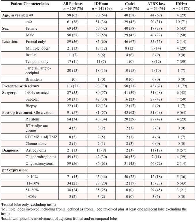 1p19q codeletion: Codeletion of 1p19q was present in 69 of 151 (46%) tumors tested: 2 of 18 (11%) A; 31 of 86 (36%) OA; and 36 of 47 (77%) O. Of the remaining 8 (of 159) tumors, 2 failed testing and 6 had insufficient tissue. All 1p19q codel tumors (n = 69) were IDH mutant (other than 3 tumors in which IDH status could not be determined).