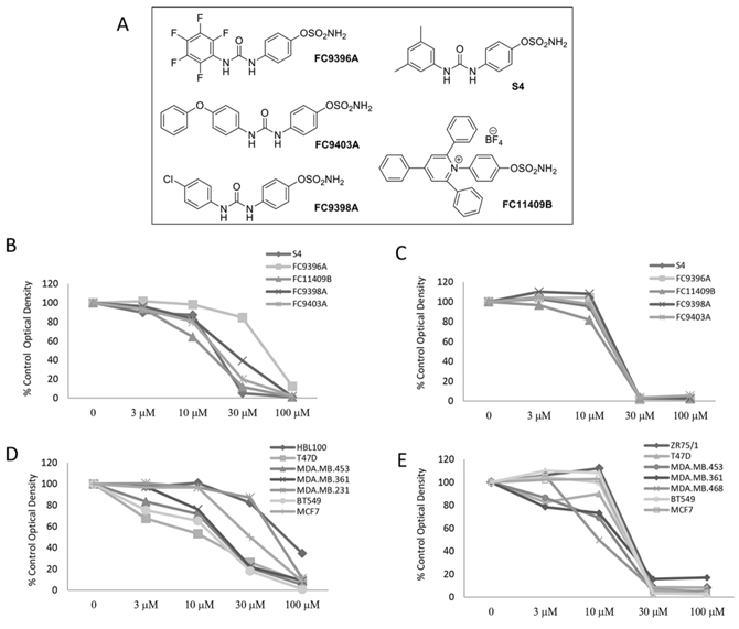 Figure 1: The anti-proliferative effects of novel ureido-sulfamate CAIX inhibitors on the growth of breast cancer cell lines in vitro. A. The structures of the 5 novel ureido-sulfamate CAIX inhibitors, FC9396A, FC9403A, FC9398A, FC11409B, and S4 used in this study. B. The effect of the CAIX inhibitors, FC9396A, FC9403A, FC9398A, FC11409B, and S4 on the proliferation of MDA-MD-231 breast cancer cells in normoxia. Compounds were used at concentrations between 3 – 100 μM. Data represents mean of n = 5 assays; 6 replicates per assay, at day 5. C. The response to the CAIX inhibitors, FC9396A, FC9403A, FC9398A, FC11409B, and S4 on the proliferation of MDA-MD-231 breast cancer cells in hypoxia (0.5% O2) Compounds were used at concentrations between 3 – 100 μM. n = 2 assays, 6 replicates per assay at day 5. D. The concentration response of a panel of various breast cancer cell lines to the CAIX inhibitor FC9396A in normoxic conditions. Compounds were used at concentrations between 3 – 100 μM. n = 3 assays, 6 replicates per assay at day 5. E. The anti-proliferative response of a panel of breast cancer cell lines to the CAIX inhibitor FC9398A used at concentrations between 3 – 100 μM, in hypoxia (0.5% O2). n = 2 assays, 6 replicates per assay at day 5.
