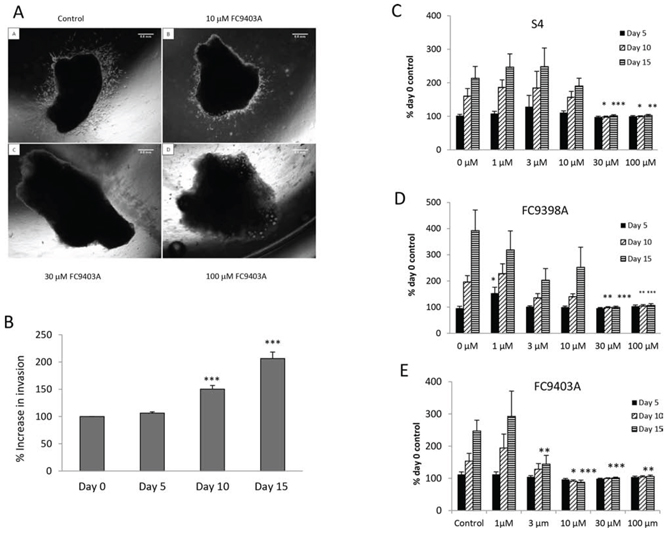 The results for S4 (Figure 3C) show at day 5 there is no significant growth under any treatment. However by day 10 and 15 the higher concentrations of S4 (30 and 100 μM) have significantly prevented growth and invasion of the tumor tissue. Similar results were obtained using the compound FC9398A and FC9403A (Figure 3D and 3E). Again, by day 15 concentrations of FC9403A from 3 to 100 μM significantly inhibited explant invasion into collagen in comparison with untreated control explants.