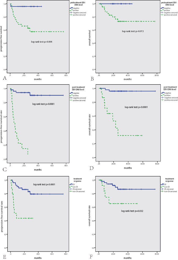 The correlation between pretreatment EBV-DNA levels and clinical features was analyzed using the Mann-Whitney test. The comparison of qualitative data was performed using the chi-square analysis. According to the method we used for EBV-DNA quantification, the detection limit was defined to be 1000 copies/mL (any level between 0–1000 copies/mL was positive, but the value was not accurate), thus we chose 0 copy/mL as the cutoff value for both pretreatment and post-treatment EBV-DNA level. Progression-free survival (PFS) was calculated from the date of diagnosis to the date of disease progression or death and was censored at the date of the last follow-up visit. Overall survival (OS) was calculated from the date of diagnosis to the date of death from any cause and was censored at the date of the last follow-up visit. Survival analysis was performed using the Kaplan-Meier method, and comparisons were calculated using the log-rank test. Multivariate analysis was used to estimate the prognostic impact of different variables in OS and PFS using the Cox regression model. Differences between the results from comparative tests were considered significant if the two-sided p value was <0.05. All statistical analyses were performed using PASW Statistics 18.0 software (Apache Software Foundation, Forest Hill, Md).