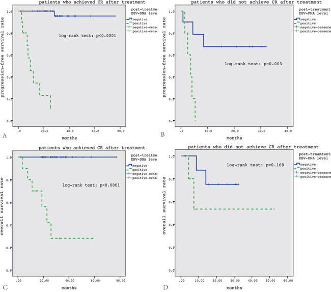 Figure 2: Subgroup survival analysis according to treatment response. In patients who got CR after treatment, positive post-treatment EBV-DNA level correlated with significantly inferior PFS and OS A, C. In patients who did not get CR after treatment, positive post-treatment EBV-DNA level correlated with significantly inferior PFS but not OS B, D.