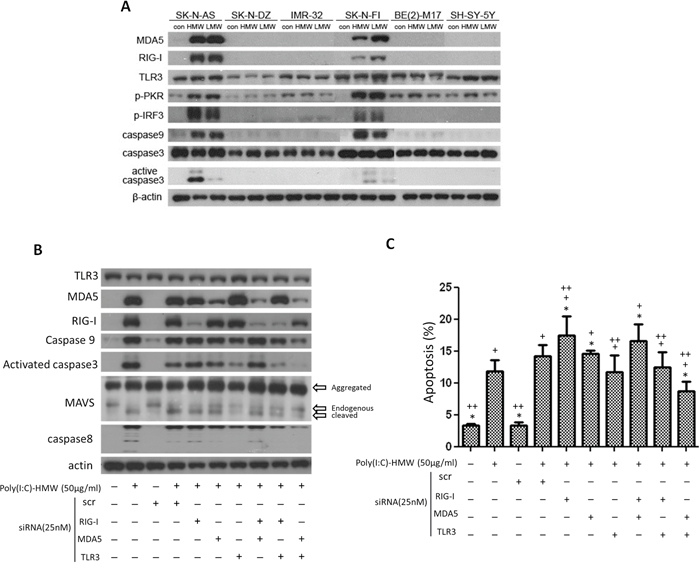 Figure 1: Differential expression of MDA5, RIG-I and TLR3, downstream signaling molecules, and cell apoptosis after treatment with poly(I:C) and siRNA. A. Up-regulation of MDA5 and RIG-I, as well as p-PKR, p-IRF3, caspase9 and active caspase3 was only observed in SK-N-AS (AS) and SK-N-FI (FI), but not in the other 4 cell lines after treatment with either high molecular weight (HMW) or low molecular weight (LMW) poly(I:C). B. In SK-N-AS cells, only concomitant knockdown of MDA5 and TLR3 were more effective to suppress upregulation of caspase9 and activated caspase 3 triggered by poly(I:C) treatment than either single knockdown or other double knockdowns of TLR3, MDA5, and RIG-I. Cleaved MAVS and caspase8 were also most significantly decreased in double knockdown of MDA5 and TLR3 C. Apoptosis measured by PI staining and flow cytometry in SK-N-AS cells after treatment with poly(I:C) and single or concomitant knockdown of TLR3, MDA5, and RIG-I. scr: scrambled siRNA. *p < 0.05 vs. Poly(I:C), +p < 0.05 vs. scr, ++p < 0.05 vs. scr+poly(I:C).