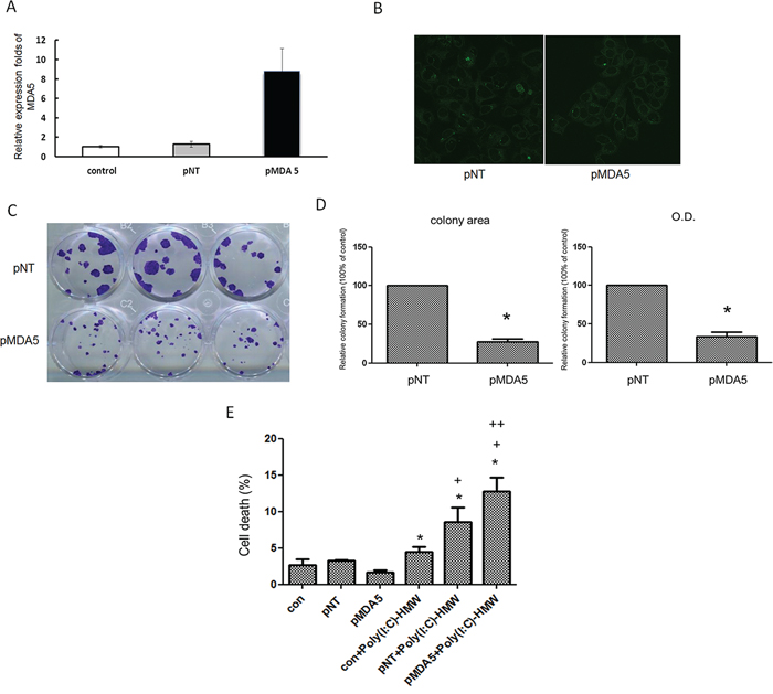 Figure 2: Over-expression of MDA5 in FaDu cells resulted in significantly less colony formation and increased susceptibility to poly(I:C). A. FaDu cells was transfected with either GFP plasmid (pNT) or MDA5 expression plasmid (pMDA5) using Lysovec reagent (InvivoGen). Real-time quantitative RT-PCR revealed more than 8-fold increase of MDA5 mRNA levels in pMDA5 transfected cells. B. Green fluorescence in pNT and pMDA5 transfected cells confirmed successful transfection. C. Significantly smaller colony formation in pMDA5 than pNT transfected cells after 4 weeks of transfection. D. The quantitative difference in the colony formation was compared by either colony area or OD value. *p < 0.05 vs. pNT. E. Trypan blue exclusion assay showed a significantly higher percentage of cell death in pMDA5 transfected cells after treatment with poly(I:C). *p < 0.05 vs. pNT, +p < 0.05 vs. con+poly (I:C), ++p < 0.05 vs.pNT+poly(I:C).