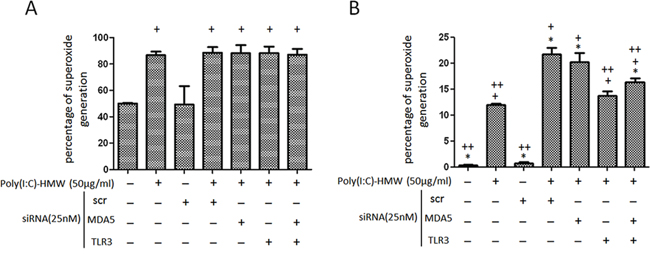 Figure 3: Intracellular and mitochondrial reactive oxygen species changes after single knockdown of TLR3 or concomitant knockdown of TLR3 and MDA5 in NB cells. A. Intracellular reactive oxygen species (ROS) determined by flow cytometry after cells stained with 6- carboxy-2, 7-dichlorodihydrofluorescein diacetate (DCF-DA) was not affected by single knockdown of TLR3 or concomitant knockdown of TLR3 and MDA5. B. Mitochondrial ROS determined by MitoSOX RED™ showed a significant decrease in either siTLR3 or combined siTLR3 and siMDA5 transfected NB cells. scr: scrambled siRNA. *p < 0.05 vs. Poly(I:C), +p < 0.05 vs. scr, ++p < 0.05 vs. scr+poly(I:C).