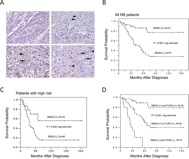 Figure 4: MDA5 expression in human NB tissues and patient survival. A. Representative pictures of immunohistochemical staining in NB tumors with various degrees of histological differentiation. Arrows and arrow heads indicate positive MDA5 staining. Original magnification 200 ×. B. Kaplan-Meier survival analysis in all NB patients according to MDA5 immunostaining. C. Kaplan-Meier survival analysis according to the expression of MDA5 in NB patients with high risk. D. Kaplan-Meier survival analysis according to the expression of MDA5 and TLR3 in NB patients. P value was calculated using log-rank test.