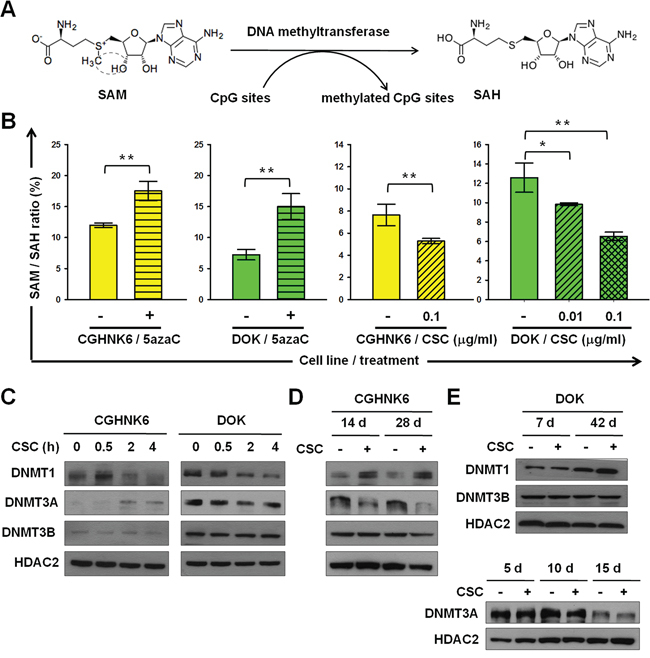 Figure 2: CSC changed the nuclear accumulation of DNMT1 and DNMT3A in CGHNK6 and DOK cells. A. DNA methylation reaction catalyzed by DNMTs. B. The SAM/SAH ratios in CGHNK6 and DOK cells with or without 5aza-C treatment for 5 days and with or without CSC treatment for 3 weeks (CGHNK6) or 5 days (DOK). Data are presented as mean ± SD (n = 3). *p < 0.05 and **p < 0.01. C, D. and E. the amounts of nuclear DNMT1, DNMT3A, and DNMT3B were determined using western blotting at the indicated CSC (0.1 μg/ml) treatment times. DMSO-treated cells were used as vehicle controls.
