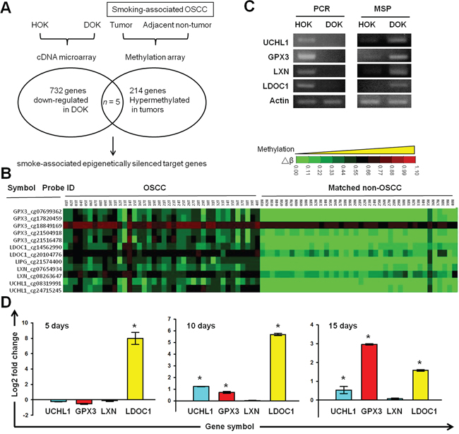 Figure 3: Identification of tumor suppressor genes silenced by cigarette exposure and DNA methylation in OSCC. A. Strategy used for integrated microarray analysis. The methylation database (GEO Accession No. GSE38532) was established from the smoking-associated OSCC patients evaluated in our previous study [10]. B. Clinical methylation profiles of GPX3, LDOC1, LIPG, LXN, and UCHL1 from tumor-nontumor pairwise smoking-associated OSCC. C. Gel images of qPCR and qMSP products from UCHL1, LXN, GPX33, and LDOC1 in DOK and HOK cells. D. Effects of CSC exposure on the promoter methylation of UCHL1, LXN, GPX33, and LDOC1. DOK cells were treated with 0.1 μg/mL of CSC for 5, 10, and 15 days and then analyzed using a qMSP.
