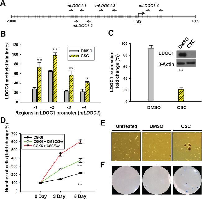 Figure 4: CSC treatment induced LDOC1 silencing and promoter methylation in untransformed CGHNK6 cells accompanied by acquiring oncogenic properties. A. Locations of qMSP primer pairs in the CpG island proximal to the LDOC1 TSS. B. The methylation of CpG sites proximal to the LDOC1 TSS was measured using qMSP. CGHNK6 cells treated with DMSO were used as vehicle controls. C. The expression of LDOC1 mRNA (bar chart) and protein (gel images) was quantified using qPCR and western blotting, respectively, in CGHNK6 cells after exposure to CSC for 3 weeks or 6 weeks. The proliferation D. sphere-forming E. and anchorage-independent growth F. of CGHNK6 cells with or without CSC treatment (0.1 μg/ml) for 3 weeks. In proliferation assay, data are presented as mean ± SD (n = 3) analysed using the Student t-test. **p < 0.01.