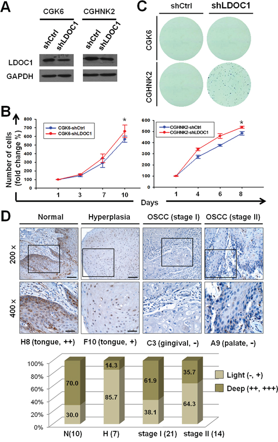 Figure 5: Downregulation of LDOC1 was involved in oral neoplastic transformation. A. Analysis of LDOC1 mRNA and protein expression in CGHNK2 and CGHNK6 cells infected with lentivirus carrying shLDOC1 or shCtrl (vector control) by quantitative real-time PCR (lower) and Western blotting analysis (upper), respectively. B. LDOC1 knockdown increased the cell proliferation of CGHNK6 (left) and CGHNK2 (right) cells. MTT assay was used to estimate the cell numbers at indicated time after seeding. Data are presented as mean ± SD (n = 3). *p < 0.05. C. Effect of LDOC1 knockdown on anchorage-independent colony forming in CGHNK6 and CGHNK2 cells. D. The expression of LDOC1 protein in normal, diagnosed tissues of oral premalignant lesion (OPML), and early stages OSCC (stage I and II). Representative images for immunohistochemical analysis of LDOC protein expression were shown. The bar chart plots percentage of high or low LDOC1 protein expression in each group of oral samples.