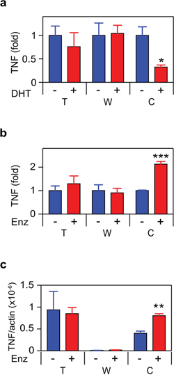 Figure 1: ADT induces TNF expression in CRPC. a. b. THP1 (T), WPMY-1 (W) or C4-2 (C) cells were treated for 72 h with vehicle (–) or 10 nM DHT (+) (a) or 10 μM enzalutamide (Enz; +) (b) TNF was assayed by ELISA (n ≥ 3). c. mRNA from cultures identical to (b) was quantitated by RT-PCR. TNF mRNA levels, normalized to ß-actin, are shown (n = 3). Treated (red) and untreated (blue) cultures compared by Student’s unpaired t-test. *p < 0.05, ***p < 0.001.