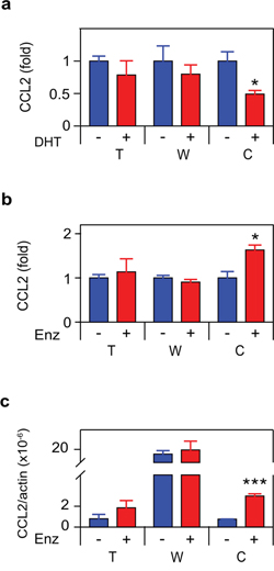 Figure 3: ADT induces CCL2 expression in CRPC cells. a. b. Cells as indicated in Figure 1 were treated for 72 h with vehicle (–) or 10 nM DHT (+) (a) or 10 μM enzalutamide (Enz) (+) (b) CCL2 was assayed by ELISA (n ≥ 3). c. mRNA from cultures identical to (b) were quantitated by RT-PCR. CCL2 mRNA levels, normalized to ß-actin, are shown (n = 3). Treated (red) and untreated (blue) cultures compared by Student’s unpaired t-test. *p < 0.05, **p < 0.01.