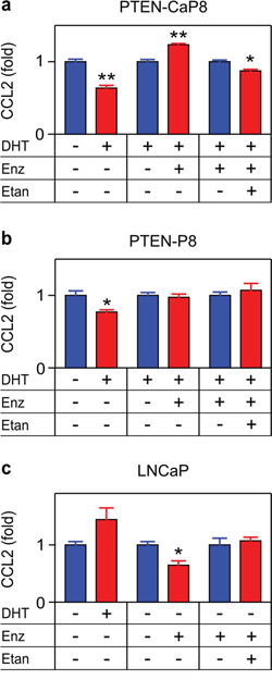 Figure 5: TNF is required for enzalutamide-induced CCL2 expression in a murine CRPC cell line. PTEN-CaP8 a. PTEN-P8 b. and LNCaP c. were treated with vehicle (–), 10 nM DHT (DHT, +), 10 μM enzalutamide (Enz, +) or 1 μg/mL etanercept (Etan, +) as indicated. Secreted CCL2 was measured by ELISA after 72 h (n ≥ 3). Treated (red) and untreated (blue) cultures compared by Student’s unpaired t-test. *p < 0.05, **p < 0.01.