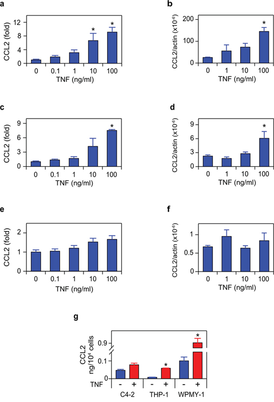 Figure 6: TNF induces CCL2 in microenvironment-derived cells. a. c. e. WPMY-1 (a) THP1 (c) and C4-2 (e) were treated with TNF for 72 h, as indicated. Secreted CCL2 was measured by ELISA (n = 3). b. d. f. RNA was extracted from WPMY-1 (b) THP-1 (d) and C4-2 (f) treated as in (a, c, e) CCL2 mRNA levels, normalized to ß-actin, are shown (n = 3). g. The amount of CCL2 secreted by the indicated cell lines, following 72 h treatment with vehicle (red) or 100 ng/mL TNF (blue). Data re-plotted from (a, c, e) Differences were assessed by one-way ANOVA, followed by Tukey-Kramer HSD test (a–f). *p < 0.05.