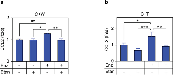 Figure 7: TNF is required for enzalutamide-induced CCL2 secretion in co-cultures. Mixed cultures of C4-2 plus WPMY-1 (C+W;) a. or C4-2 PCa plus THP1 (C+T;) b. were treated with vehicle (–), 10 μM enzalutamide (Enz, +) or 1 μg/mL etanercept (Etan, +) for 72 h, as indicated. Secreted CCL2 was measured by ELISA (n ≥ 3). Differences were assessed by one-way ANOVA followed by Tukey-Kramer HSD test. *p < 0.05, **p < 0.01, ***p < 0.001.