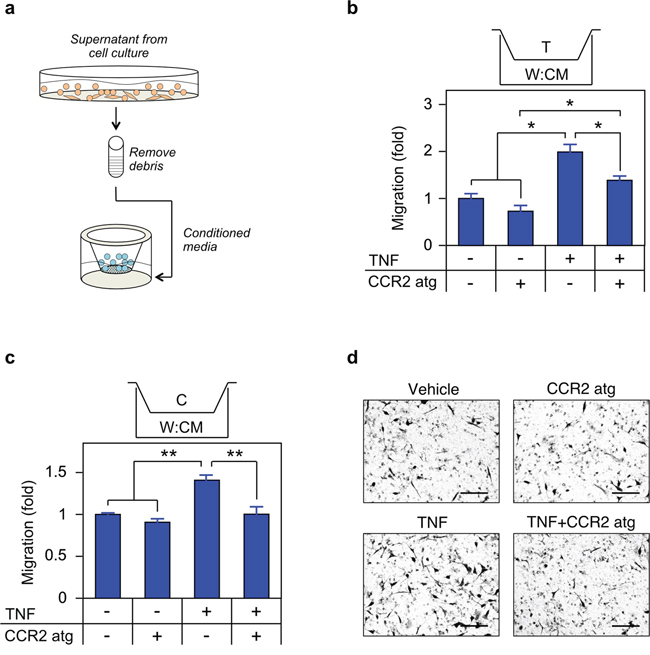 Figure 8: TNF induced CCL2 signaling is required for migration. a. Schematic of migration assay. b. c. THP1 (b) or C4-2 (c) were seeded in the upper chamber and migration determined as in Materials and Methods (n = 3). CM was from cells grown for 72 h in media plus vehicle (–) or 100 ng/mL TNF (TNF, +). The CCR2 antagonist (CCR2 atg, +) was added to the CM, as indicated. d. Representative photomicrographs of migrated C4-2 cells from (c) Magnification, 460 ×; scale bar, 100 μm. Differences were assessed by one-way ANOVA followed by Tukey-Kramer HSD test. *p < 0.05, **p < 0.01.