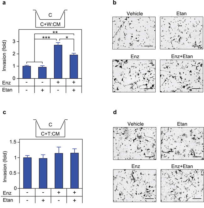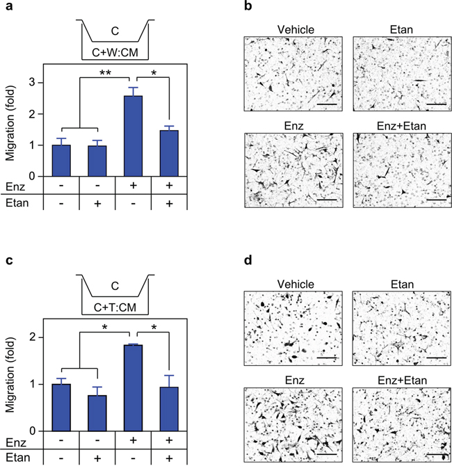 Figure 9: Secreted TNF is required for enzalutamide-induced migration. a. c. Transwell migration assays were performed as in Figure 8, with C4-2 cells seeded in the upper chamber and migration determined as in Materials and Methods (n = 3). CM derived from mixed cultures of C4-2/WPMY-1 (a) or C4-2/THP1 (c) grown for 72 h in the presence of vehicle (–), 10 μM enzalutamide (Enz, +) or 1 μg/mL etanercept (Etan; +), as indicated. b. d. Representative photomicrographs of migrated C4-2 cells from (a) and (c) respectively. Magnification, 460x; scale bar, 100 μm. Differences were assessed by one-way ANOVA followed by Tukey-Kramer HSD test. *p < 0.05, **p < 0.01