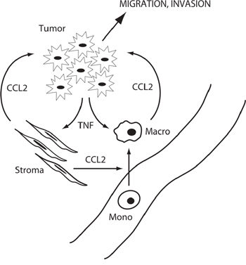 Figure 12: Schematic of microenvironment interactions. Tumor cells produce TNF in response to ADT, which induces CCL2 in stromal cells and macrophages, and promotes tumor cell migration and invasion and monocyte migration and differentiation to macrophages.