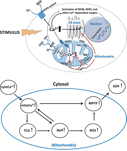 Overall, Ca2+ accumulation in mitochondria coordinates multiple coupled processes into cross-regulatory transduction loops and, thus, allows connecting metabolic demands with cell fate (apoptosis, proliferation, etc.).
