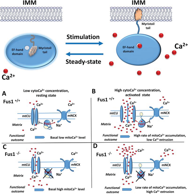 Figure 2: Hypothetic scheme of Fus1 functioning in mitochondria. Upper panel. Putative mechanism of molecular organization and activity of Fus1. At Ca2+- free or low Ca2+ conditions (steady-state), EF-hand domain (open circle) of Fus1 protein is not occupied by Ca2+ ions while its myristoyl tail is folded inside the hydrophobic pocket of the protein preventing Fus1 from anchoring the membranes (left). Upon stimulation, elevation of Ca2+ in cytosol (red circles) results in Ca2+ ion binding to the EF-hand domain, release of myristoyl tail and anchoring of Fus1 protein to IMM. Lower panel. A. At Ca2+-free or low Ca2+ conditions, Fus1 may inhibit mtCU while simultaneously maintain the mNCX active state thus preventing accumulating Ca2+ in mitochondria. B. Elevation of Ca2+ leads to Fus1 activation and anchoring in IMM. Membrane tethering allows Fus1 to activate mtCU and inhibit mNCX that leads to retention of Ca2+ in mitochondrial matrix. C. When Fus1-mediated gatekeeping function is lost at a steady state, the mtCU channel is not tightly closed allowing cytosolic Ca2+ uptake while mNCX does not return Ca2+ ions back to cytosol. Thus, Ca2+ concentration in mitochondria of Fus1-deficient cells is higher. D. When Fus1-mediated gatekeeping function is absent during activation, the mtCU channel does not open to a full extent leading to insufficient buffering of cytosolic Ca2+ signals. Additionally, mNCX is over-activated resulting in extrusion of Ca2+ from mitochondria and an overall slow rate of mitochondrial Ca2+ accumulation.