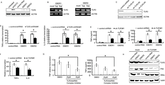 Figure 2: EBERs trigger inflammatory response in vitro via TLR3 in NPC cell lines. A. Protein was extracted and subjected to western blotting to verify TLR3 expression after HNE2 cells were treated with in vitro transcribed EBER1 or EBER2. Poly(IC) was used as a positive control and tRNA was used as negative control RNA. B. HNE2 cells were challenged with different doses of in vitro transcribed EBER1 or EBER2 for 24 h and mRNA level of TLR3 was determined by RT-PCR. C. Lenti-virally knockdown TLR3 was verified in HNE2 cells by western blotting. D. HNE2 cells transduced with Lenti-shRNA-TLR3 were stimulated with in vitro transcribed EBER1 or EBER2. mRNA levels of inflammatory cytokines (TNFα and IL-6) were analyzed by qPCR; TNFα and IL-6 released into the supernatant of cultured HNE2 cells were measured by ELISA as in E. F. mRNA levels of TNFα and IL-6 in C666–1 cells transduced with sh-TLR3#1 cells were determined by qPCR 48 h post transduction. G. C666–1 cells were challenged with the TLR3-dsRNA complex inhibitor for 48 h and TNFα transcripts and release into the culture supernatant were measured by qPCR (left) or ELISA (right). H. p50 and IκBα expression status was verified by western blotting in TLR3 knockdown or mock treated HNE2 cells after challenged with control RNA or in vitro transcribed EBER1 or EBER2. All experiments were performed at least 3 times and data were expressed as mean ± SD. *P < 0.05 between assigned groups.