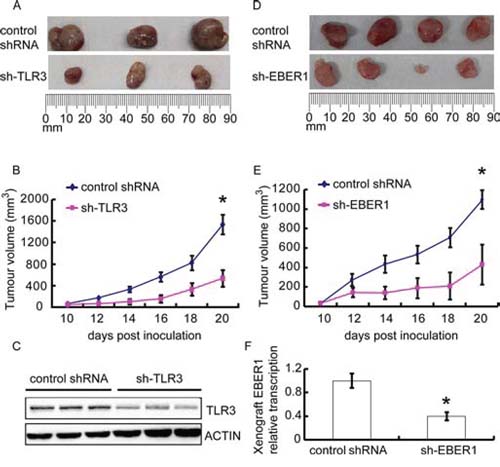 Figure 5: Effect of EBER-induced inflammation via TLR3 on human NPC xenograft growth in vivo. C666–1 cells transduced with TLR3 shRNA A–C. or EBER1 shRNA D–F. were injected subcutaneously into female nude mice, and the tumors were allowed for growth for 20 days. (A) and (D) images of xenograft tumor size at day 20. (B) and (E) the xenograft growth curves. N = 3 or 5 respectively. (C) and (F) indicated that TLR3 or EBER1 were efficiently down-regulated in xenografts. Data are representative of three similar experiments. *P < 0.05 versus control group in (B), (E) and (F)