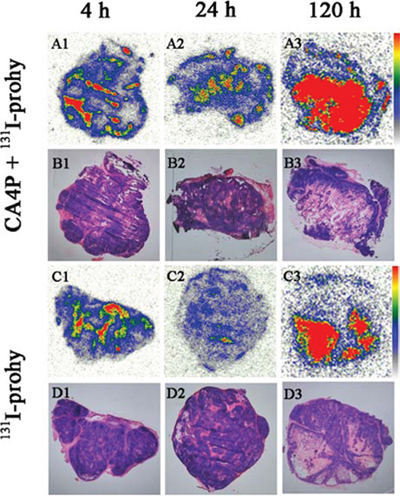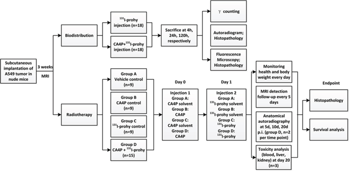 Forty two tumor-bearing nude mice were divided into four subgroups (n = 9, each group, 6 extra animals were added in Group D for general phosphor screen analysis): group A of vehicle controls received iv injections of the solvents of CA4P and 131I-prohy; group B of CA4P control received CA4P (10 mg/kg) and solvent of 131I-prohy; group C of 131I-prohy control received 131I-prohy (185 MBq/Kg) and solvent of CA4P; group D of CA4P + 131I-prohy treatment received iv injections of CA4P (10 mg/kg) and 131I-prohy (185 MBq/Kg).