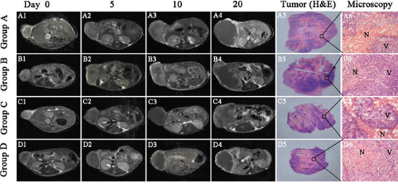 MRI was performed before administration and every 5 days after administration to monitor and quantify tumor volume and necrosis using a clinical 1.5T MR magnet (Echo speed; GE, Milwaukee, WI). Nude mouse was anesthetized by a small-animals gas anesthesia machine (Matrix VMP; GENE&I, Beijing, People's Republic of China) with isoflurane and placed in a mouse holder in supine position for imaging acquisition. T1-weighted, T2-weighted and contrast enhanced T1-weighted (CE-T1) spin-echo multi-slice transverse images were acquired. Related parameters are transverse plane in all mice with slice thickness of 1 mm and a gap of 0 mm; T1WI (Sequences SE, TR/TE = 550 ms/24 ms); T2WI (Sequences FSE, TR/TE = 2920 ms/88 ms). CE-T1 (Sequences SE) was detected after iv injection of Magnevist (Bayer Schering Pharma AG, Berlin, Germany) at 0.2 mmol/Kg.