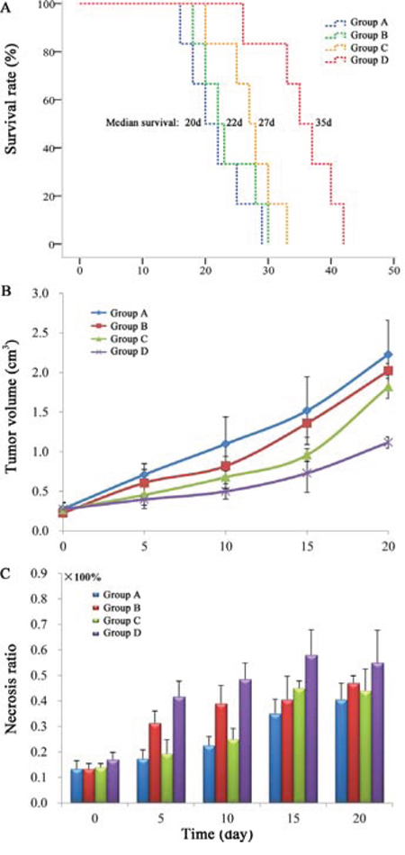 Body weight was recorded daily to monitor the health of nude mice. Animals of group D were sacrificed by overdose of anesthetic at day 5, 10, 20 post administration (n = 2 per time point) and cut into 0.5 cm slices after freezing for anatomical autoradiography analysis. Anatomical autoradiographs were obtained by 6 h exposure to a high performance storage phosphor screen to observe the biodistribution in the body of nude mice. Blood was collected at day 20 (n = 3 per group) for hematological biochemical parameters analysis including blood indexes, hepatic and renal function indexes (Modular DP, Roche Company, Mannheim, Germany) to evaluate the drug toxicity. Time to endpoint of every nude mouse was recorded for survival analysis. At endpoint, tumors were excised and cut into 5 μm frozen sections for histopathological findings. Histopathology of group A, B, C and D were carried out for postmortem verification.