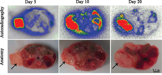 Tumor and liver at each time point of biodistribution analysis were sampled and cut into 50 μm frozen sections with a cryotome (Shandon, Thermo Fisher Scientific, Waltham, MA). Autoradiographs of these 50 μm Sections were obtained by 12–24 h exposure to a high performance storage phosphor screen. Images of the screen were read using Optiquant software (Cyclone; Canberra-Packard, Ontario, Canada). Subsequently, tumor sections were stained with haematoxylin-eosin (H&E) and digitally photographed. Relative tracer concentration in the necrotic tumor was estimated by manually drawing the regions of interest analysis for the necrotic and viable tumor as well as liver tissue on all autoradiographs. Necrotic and viable tumor was distinguished according to the histological examination of H&E stained sections. Autoradiograph of liver was used as a reference of radioactivity.
