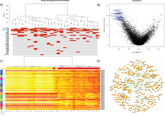 Tumor only data (gene regions for methylation) was first filtered by taking the top 25% most variant probes using genefilter's varFilter function. The Scale Free Topology plot was used either selecting the lowest power where the curve flattens out or the scale free R^2 > 0.8 (value equated to 6 in gene expression and 12 in methylation). Associations to traits/mutations were identified using the module eigengene's correlation with the external trait information, which were set stringently (Supplementary Figure S3 IIA and S IIB). Module visualization was performed using NetBioV where, a filter was applied on the distribution of all possible correlations among the modules by a bonferoni corrected p-value ≤ 0.001 [33]. The largest connected complex in each module was selected for NetBioV. All modules’ largest connected complexes not selected for main manuscript (Figure 1D and 2D) are supplied as supplementary data (Supplementary Figure S1 and S2), where any connected hubs above 10 vertices other than the main complex, denoted by the specific module plus ‘B’, ‘C’ etc. have also been included. DAVID functional annotation analysis was then used on the key largest connected complexes [34, 35].