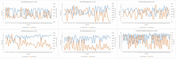Figure 3: Correlation between DNA methylation and gene expression. A–E. Inverse correlation for the top 5 genes from array data, n = 45 (primary axis – methylation, secondary axis – expression). F. Inverse correlation between pyrosequencing and immunohistochemistry for CHN2, n = 56.