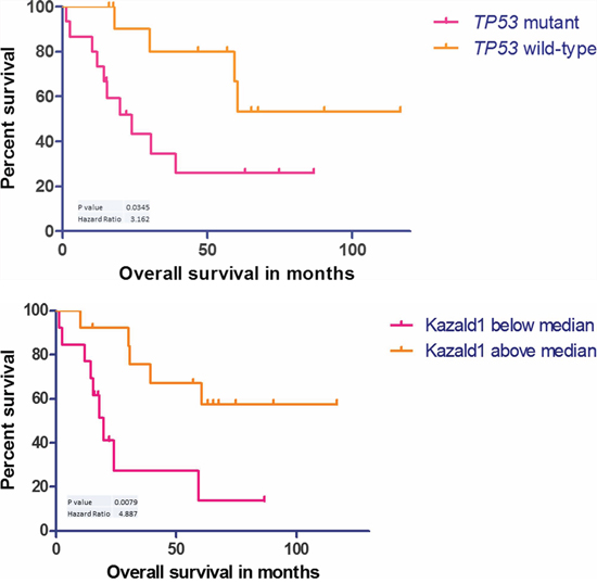 Figure 4: A. Kaplan–Meier curve showing survival advantage for wild-type p53 cases, n = 27. B. Kaplan–Meier curve showing survival disadvantage for cases with Kazald1 hypomethylation, n = 26.