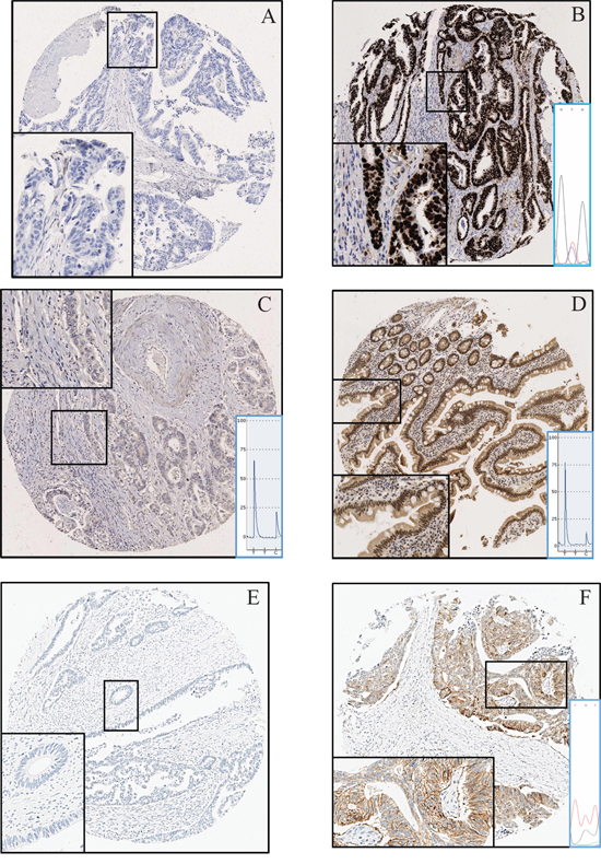 Figure 5: Immunohistochemistry. A. p53 wild type tumor showing no staining (extreme negative). B. p53 mutant tumor showing extreme positive staining. The C > T substitution can be seen as confirmed by Sanger sequencing C. No CHN2 protein expression in tumor. A low T and high C peak show a highly methylated CpG D. CHN2 protein expression in normal small bowel. A high T and low C peak show an unmethylated CpG E. Tumor with no Her2 expression. F. Tumor with a Her2 c.2329G > T (Substitution) mutation expressing the protein.