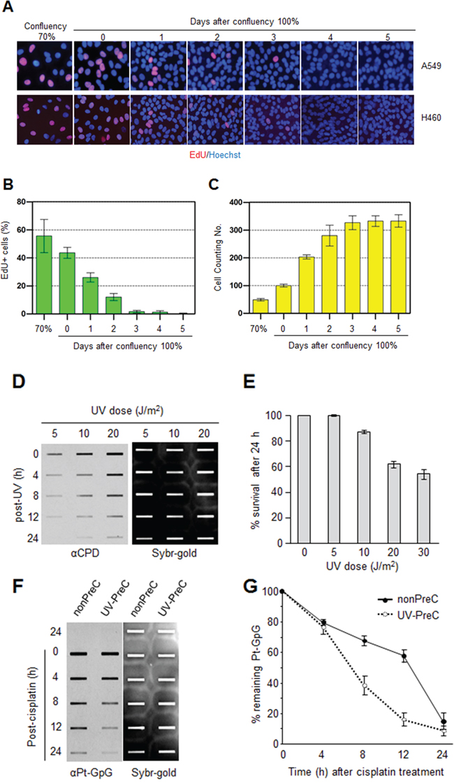 Figure 1: Preconditioning of cells with UV irradiation facilitates subsequent repair of cisplatin-induced damage. A. A549 and H460 lung carcinoma cells were grown to the indicated density 70% or 100%. The 100% confluency is designated at the time when there is no space among the cells. EdU was added 2 h before fixation at the indicated culture density and days after 100% confluent. B. EdU-positive A549 cell numbers were counted among 1000 cells. C. The number of A549 cells in at day 0 of 100% confluent was designated as 100 control. The cell numbers from the other samples were plotted as relative values compared to control. The bars and error bars represent the mean ± s.d (n = 3). D. A549 cells irradiated with the indicated UV doses were allowed to carry out repair for the indicated times, followed by isolation of genomic DNA and immunoslot blotting analysis to detect residual cyclobutane pyrimidine dimers (CPDs). After immunoslot blotting, the membrane was counterstained with SYBR-Gold for a loading control of genomic DNA. E. Cell viability after UV irradiation was assessed by fluorescence-based cell viability assay. Constitutive protease activity within live cells was measured using a fluorogenic and cell permeable peptide substrate using CellTiter-Fluor Cell Viability Assay kit. The fluorescent signal obtained from mock-treated cells was designated as 100 and the relative values obtained from UV-exposed cells were plotted. The bars and error bars represent the mean ± s.d (n = 3). F. Removal rates of platinum-GpG (Pt-GpG) from nonpreconditioned (nonPreC) or UV-preconditioned (UV-PreC) cells. Cells were either mock-treated (nonPreC) or 5 J/m2 of UV-treated (UV-PreC) and kept for 24 h and followed by 10 μM of cisplatin treatment for 2 h and then culture medium was changed to wash out residual cisplatin in the medium. Recovery times were allowed for the indicated times and genomic DNAs obtained from each time point were assessed by immunoslot blotting using Pt-GpG-specific monoclonal antibody. G. The quantitative analysis for (F). The bars and error bars represent the mean ± s.d from three independent experiments.