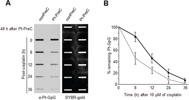Figure 3: Enhanced Pt-GpG adduct removal by Pt-PreC. A. Cells preconditioned with 5 μM of cisplatin or mock were treated with 10 μM of cisplatin, and Pt-GpG adduct removal rate was measured using immunoslot blotting with Pt-GpG adduct-specific monoclonal antibody. B. The quantitative analysis for (A) The bars and error bars represent the mean ± s.d from three independent experiments.