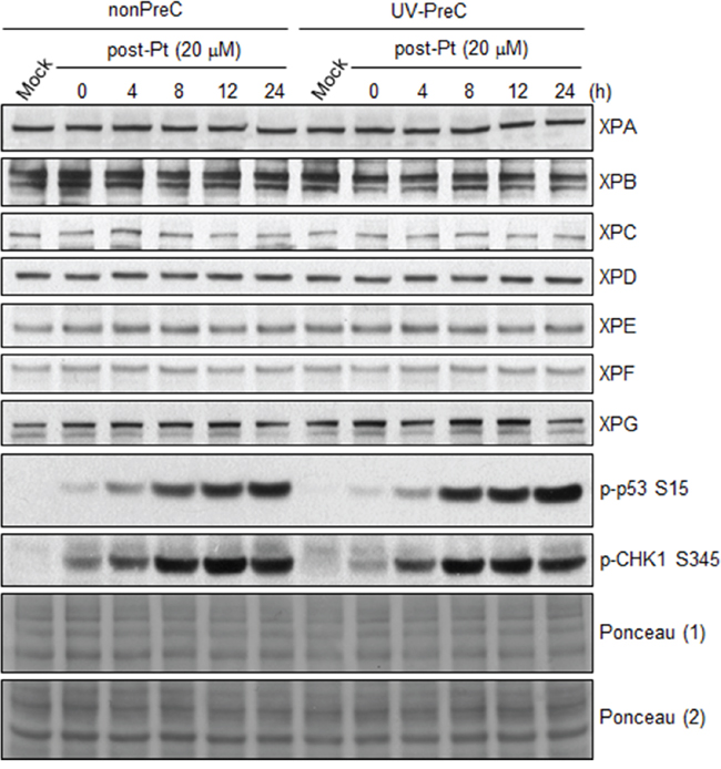 Figure 5: PreC does not alter the protein expression of core NER factors nor ATR activity. 24 h later of UV-PreC with 5 J/m2, cells were treated with 20 μM of cisplatin for 2 h and then cells were allowed to recover for the indicated times. Protein levels of core NER factors (XPA-XPG) and ATR substrate proteins (p-p53 and p-CHK1) were assessed by immunoblotting with the indicated antibodies. Ponceau stained blots from two different gels were used to indicate equal loading of the samples.
