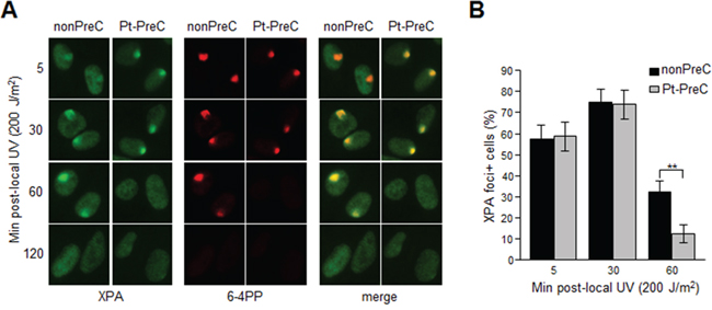 Figure 6: PreC accelerates XPA binding to DNA lesions. A. 6-4PP removal kinetics and lesion-specific XPA binding from cells preconditioned with nonPreC control or Pt-PreC were monitored after 200 J/m2 of local UV irradiation using isopore filter with 5 μm in diameter. B. The number of XPA foci-positive cells was calculated among 1000 cells counted. Results are presented as mean ± SD from three independent experiments. Differences were considered significant at the value of P < 0.01 (**).
