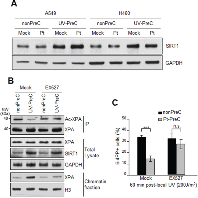 Figure 7: Upregulation of SIRT1 expression during PreC. A. SIRT1 expression from A549 and H460 preconditioned with nonPreC or UV-PreC was assessed by immunoblotting. GAPDH was used as a loading control. B. Acetylation of XPA was assessed by immunoprecipitation of XPA followed by immunoblotting with anti-acetyl-lysine antibody in the presence or absence of EX527, the SIRT1-specific inhibitor. PreC cells were pretreated with EX527 for 5 h before cisplatin treatment. Histone H3 was used to indicate chromatin-enriched fraction. C. 6-4PP repair kinetics from nonPreC or Pt-PreC was measured in the presence or absence of EX527. 60 minutes after local UV irradiation the 6-4PP foci-positive cells were counted from randomly selected 1000 cells in each sample. The bars and error bars represent the mean ± s.d from three independent experiments. Differences were considered significant at the value of P < 0.001 (***).