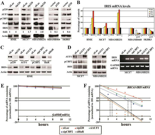 Figure 3: BRCA1/p220 controls BRCA1-IRIS mRNA stability. (A) Expression of the indicated proteins in BRCA1/p220-silenced HME, MCF7 and MDAMB231 cells (left) or BRCA1/p220 overexpressing MDAMB468 and SKBR3 cells (right). (B) Expression of BRCA1-IRIS mRNA in BRCA1/p220-silenced HME, MCF7 and MDAMB231 cells (left) or BRCA1/p220 overexpressing MDAMB468 and SKBR3 cells (right). (C) Expression of the indicated proteins in BRCA1/p220-, AUF1-, pCBP2- or HuR-silenced HME cells (upper panel) and the expression of BRCA1-IRIS in these cells (lower panels). (D) Expression of the indicated proteins (72h, left) or BRCA1-IRIS mRNA (at 25 PCR cycle, at 72h) in control-, AUF1-, or pCBP2-silenced MCF7 or MDAMB231 cells. Stability (t1/2) of GAPDH (E) or BRCA1-IRIS (F) mRNAs as detected using real-time RT-qPCR analysis in BRCA1/p220-, AUF1-, pCBP2- or HuR-silenced HME cells treated with Actinomycin D (Act D) during the last 10h. Data are normalized to the levels of 18S rRNA in each experiment and are represented as a percentage of the mRNA levels measured at time 0 (before Act D addition) or 2, 4, 6, 8 and 10h after Act D addition using a semi-logarithmic scale. Data are presented as the means ± SD from triplicates, done three independent times (in all cases p≤0.001 compared to sicontrol cells).