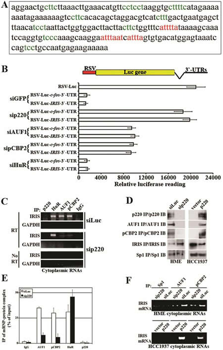 Figure 4: Identification and analysis of AREs motifs in BRCA1-IRIS 3`-UTR region. (A) The 3`-UTR region of BRCA1-IRIS (i.e. part of BRCA1/p220 intron 11) where putative AUF-1 (red sequences) and pCBP2 (green sequences) binding sites are shown. (B) Plasmids carrying BRCA1-IRIS or c-fos 3`UTRs downstream of the luciferase gene in RSV-plasmid were transfecetd in HME with siGFP, siBRCA1/p220, siAUF1, sipCBP2 or siHuR and the luciferase activity expressed from these different plasmids was measured using luminometer. Data are represented as means ± SD from triplicates done three independent times (in all cases p≤0.01 compared to RSV-Luc alone). (C) Representative PCR analyses of the binding of BRCA1-IRIS mRNA to AUF1, pCBP2, HuR in untreated HME cells cytoplamsic proteins (polysomes), while binding only to HuR in BRCA1/p220-silenced HME cells. (D) Immunoprecipitation of the indicated proteins in BRCA1/p220-silenced HME cells (left), or from BRCA1/p220-reconstituted HCC1937 cells (right). (E) Immunoprecipitated mRNP-protein complex as percentage of input using AUF1, pCBP2, HuR and BRCA1/p220 antibodies and IgG from cells transfected with control or BRCA1/p220 siRNA. (F) Representative PCR analyses of the binding of AUF1 and pCBP2 to BRCA1-IRIS mRNA in BRCA1/p220-silenced HME cells (upper) or BRCA1/p220-overexpressing HCC1937 (lower) cytoplasmic proteins (polysomes).