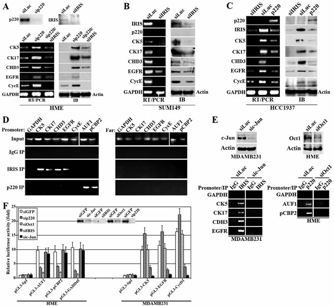 Figure 5: The effect of BRCA1-IRIS and BRCA1/p220 on the expression of several TN/BL markers. Expression of the indicated TN/BL markers mRNAs (left) or proteins (right) in BRCA1/p220-silenced or BRCA1/p220 and BRCA1-IRIS co-silenced HME cells (A), BRCA1-IRIS-silenced SUM149 cells (B), BRCA1/p220 overexpressing or BRCA1-IRIS silenced HCC1937 cells (C). (D) PCR analysis showing promoters (left) or 10kb upstream regions (right) of CK5, CK17, CDH3, EGFR, cyclin E, AUF1 and pCBP2 in BRCA1-IRIS or BRCA1/p220 immunoprecipitation from cross-linked HME cells using mono-specific antibodies. (E) ChIP analysis of the promoters of the indicated TN/BL markers in control- or c-Jun-silenced MDAMB231 cells or control- or Oct1-silenced HME cells. (F) Analysis of the indicated promoters activation in HME cells (left) or MDAMB231 (right) depleted from BRCA1/p220, Oct1, BRCA1-IRIS or c-Jun. Inset is the effect of each siRNA on its cognate protein in HME cells.