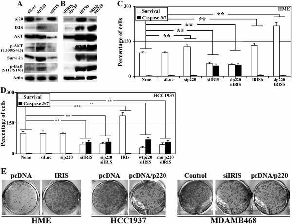 Figure 6: The effects of BRCA1-IRIS and/or BRCA1/p220 on the expression and activation of survival proteins, cell survival and transformation. Expression or activation of the indicated proteins in control, BRCA1-IRIS, BRCA1/p220 silenced (A), BRCA1-IRIS overexpressing or BRCA1-IRIS overexpressing and BRCA1/p220-silenced (B) HME cells. (C) Percentage of viable (MTT assay analysis) or dying (caspase 3/7 assay analysis) cells, respectively in HME cells treated as in A and B. Data are presented as means ± SD from triplicate, done three independent times, whereas ** is a p≤0.01. (D) Analysis of viability detected using MTT assay and cell death detected using caspase 3/7 assays in BRCA1-IRIS-silenced and/or wild type or clinically relevant mutant BRCA1/p220 overexpressing HCC1937 cells. Data are presented as the means ± SD from triplicate, done three independent times, whereas ** is a p≤0.01. (E) Soft agar analysis of control or BRCA1-IRIS overexpressing HME cells (left), control or BRCA1/p220 overexpressing HCC1937 cells (middle), or control, BRCA1-IRIS-silenced or BRCA1/p22