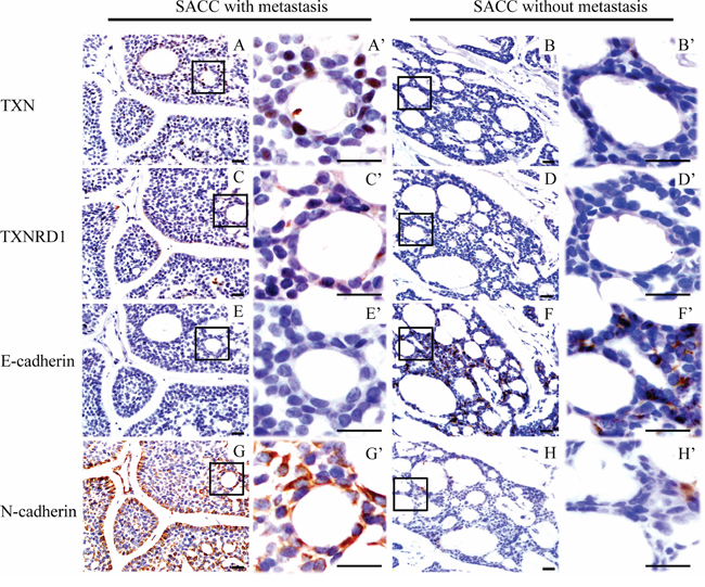 Figure 1: Immunohistochemical staining reveals differential expressions of thioredoxin 1 (TXN), thioredoxin reductase 1 (TXNRD1) and epithelial-mesenchymal transition signs in salivary adenoid cystic carcinoma (SACC) samples from patients with/without lung metastasis. Higher expression of TXN (AA’), TXNRD1 (CC’) and N-cadherin (GG’) in SACC tissues with metastasis compared to those without metastasis (BB’, DD’, HH’), respectively. Lower expression of E-cadherin in SACC tissues with metastasis (EE’) compared to those without metastasis (FF’). Scale bar = 20 μm, A’-H’ show enlarged fields of the inset squares in panels A–H.